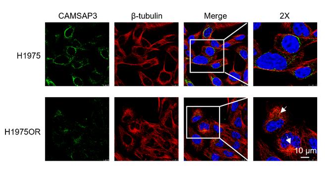 微管作为细胞骨架关键组成部分,参与调控EGFR内体循环等重要过程,然而其在奥希替尼耐药中的作用机制一直未被研究清楚。本研究首先观察到耐药细胞中微管结构发生显著重塑(图1);进一步通过微管相关基因筛选,锁定CAMSAP3是介导这一形态变化的关键因子;并发现调控CAMSAP3的表达水平能够改变NSCLC细胞对奥希替尼的敏感性。