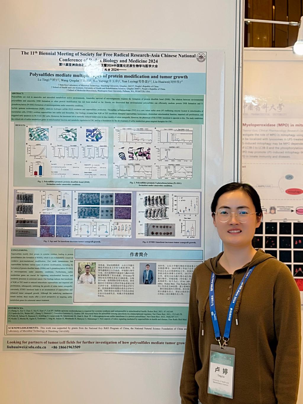 我校生命科学与健康学院卢婷老师展示了“超级硫化物介导蛋白质多种翻译后修饰类型以及在肿瘤生长中发挥重要作用”的研究结果,该研究揭示了超级硫化物对细胞信号转导和线粒体健康的调控机制,拓展了超级硫化物在肿瘤治疗中的应用潜力。