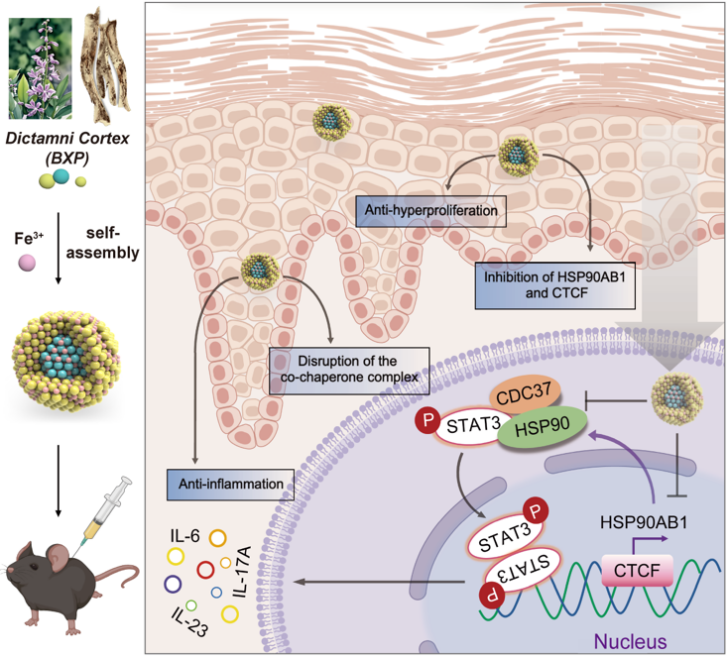 为解决白鲜皮的应用局限,研究团队开发了基于白鲜皮的新型制剂(BXP-Fe (Ⅲ)ICPs,简称 NB)。该制剂无需额外载体,能针对性改善白鲜皮的药理缺陷:一方面提升了其在体内的利用效率,另一方面可在银屑病炎症部位的酸性微环境中精准释放有效成分,避免健康组织受损;同时,制剂中的成分还能补充银屑病患者表皮中显著减少的铁元素,协同辅助治疗。