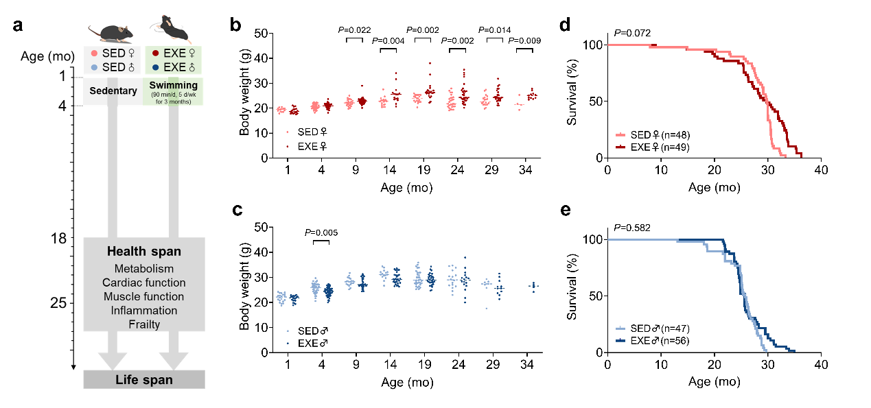 为了探究早期运动对寿命的影响,研究人员从1月龄至3月龄让运动组的小鼠持续进行中等强度的游泳训练,此后所有的小鼠都自然饲养不进行任何干预,直至小鼠“寿终正寝”。该研究纳入了几百只雌性和雄性的小鼠,仅就饲养小鼠到自然死亡的实验就进行了超过三年。结果并不是想象或预期的“长寿”,统计学结果显示早期运动雌雄小鼠的整体寿命并未得到延长。