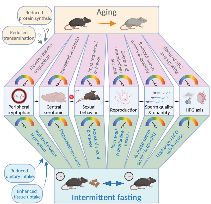 进一步研究发现,节食小鼠脑内血清素(serotonin)浓度显著下降。血清素是一种通常具有抑制性行为作用的神经递质,其合成依赖于色氨酸——一种人体不能自行合成、必须通过饮食获取的必需氨基酸。节食限制了色氨酸摄入,从而间接导致血清素减少。“这些小鼠像是‘性抑制解除’,表现出前所未有的活跃,”Ehninger教授解释道,“这提示我们,饮食中的色氨酸及其代谢通路对性欲调控具有重要作用。”