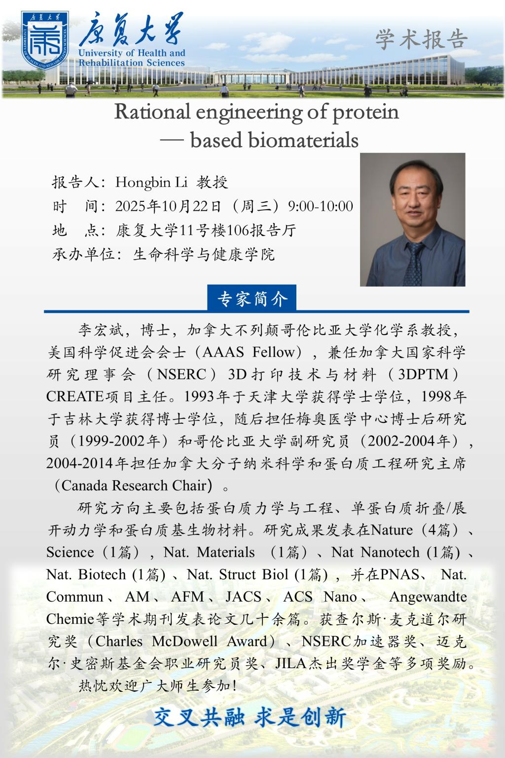 学术报告:Rational engineering of protein - based biomaterials