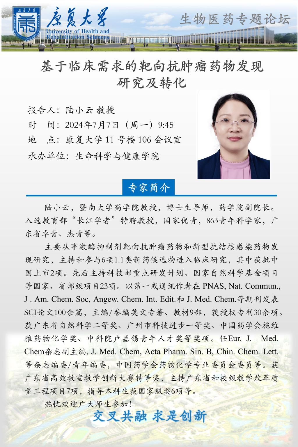 学术报告:基于临床需求的靶向抗肿瘤药物发现研究及转化